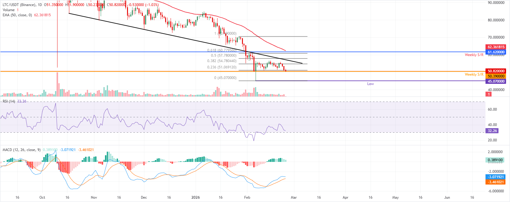 Harga Litecoin diperdagangkan di $50,39 pada saat berita ini ditulis pada hari Selasa. Exponential Moving Average (EMA) 50-hari menurun di $62,36, mempertahankan bias bearish saat harga berada di bawahnya. Rallies tetap terbatasi di bawah rata-rata ini, menjaga upaya pemulihan tetap rapuh.