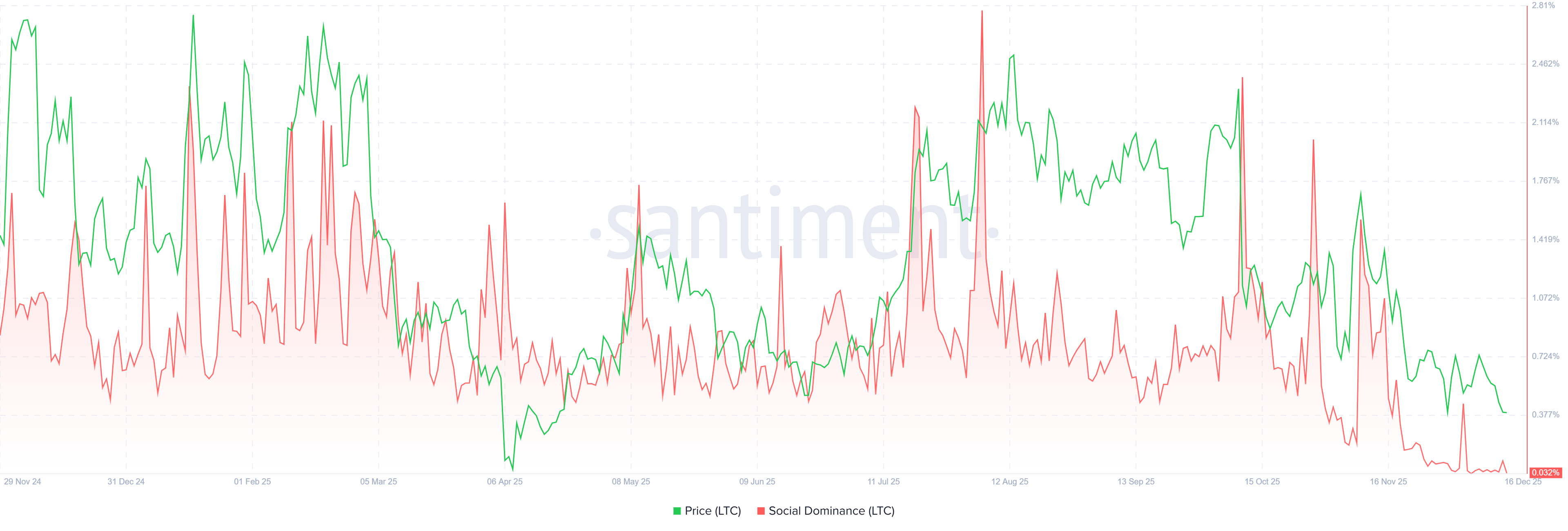 Metrik Dominasi Sosial Santiment untuk Litecoin mendukung prospek bearish. Indeks ini mengukur pangsa diskusi terkait LTC di media mata uang kripto. Indeks ini telah secara konsisten menurun sejak awal Desember, mencapai titik terendah tahunan 0,032% pada hari Selasa. Penurunan ini mengindikasikan minat pasar memudar dan sentimen melemah di antara para investor LTC.