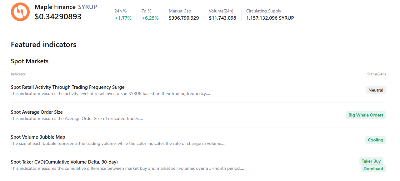 Data ringkasan CryptoQuant mendukung prospek bullish, karena pasar spot SYRUP menunjukkan order besar dari whale, kondisi mendingin, dan dominasi beli. Semua faktor ini mengindikasikan bahwa Maple Finance mungkin sedang memposisikan diri untuk menunjukkan penembusan dalam beberapa hari mendatang.