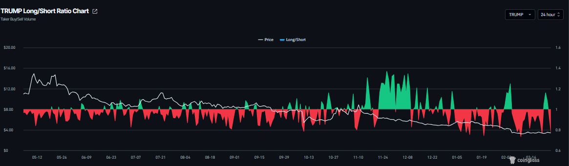 Selain itu, rasio long-to-short TRUMP berada di 0,78 pada hari Jumat, mendekati level terendahnya dalam lebih dari sebulan. Rasio di bawah 1 ini menunjukkan sentimen bearish karena para pedagang bertaruh pada penurunan harga koin meme.