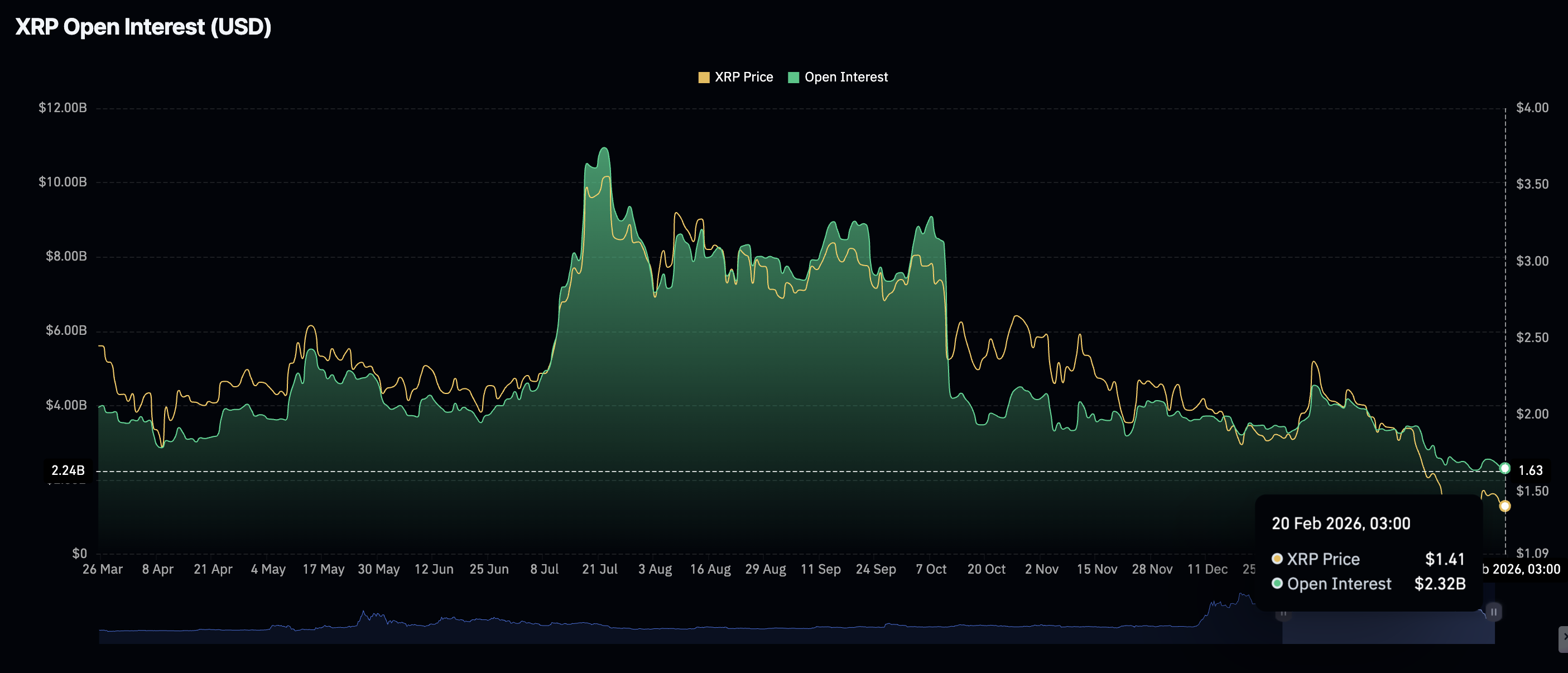 Pasar derivatif XRP menggambarkan gambaran yang lebih suram, dengan Open Interest (OI) berjangka jatuh menjadi $2,32 miliar pada hari Jumat dari $2,45 miliar pada hari sebelumnya. Sebagai konteks, minat ritel mencapai puncaknya di $4,55 miliar pada 6 Januari, yang jauh di bawah rekor OI tertinggi sebesar $10,94 miliar yang dicapai pada bulan Juli.