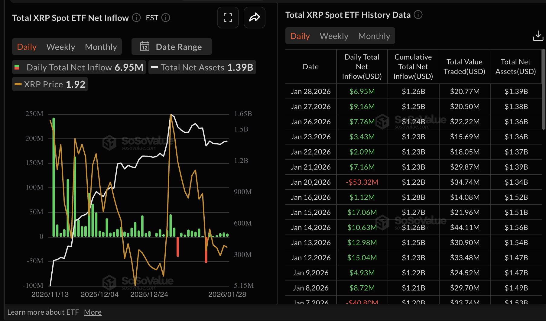 Sementara itu, XRP memiliki dukungan institusional yang tak tergoyahkan melalui Exchange-Traded Funds (ETF) yang terdaftar di AS, yang mencatat hampir $7 juta dalam arus masuk pada hari Rabu. Total arus masuk kumulatif mencapai $1,26 miliar, dan aset yang dikelola mencapai $1,39 miliar.