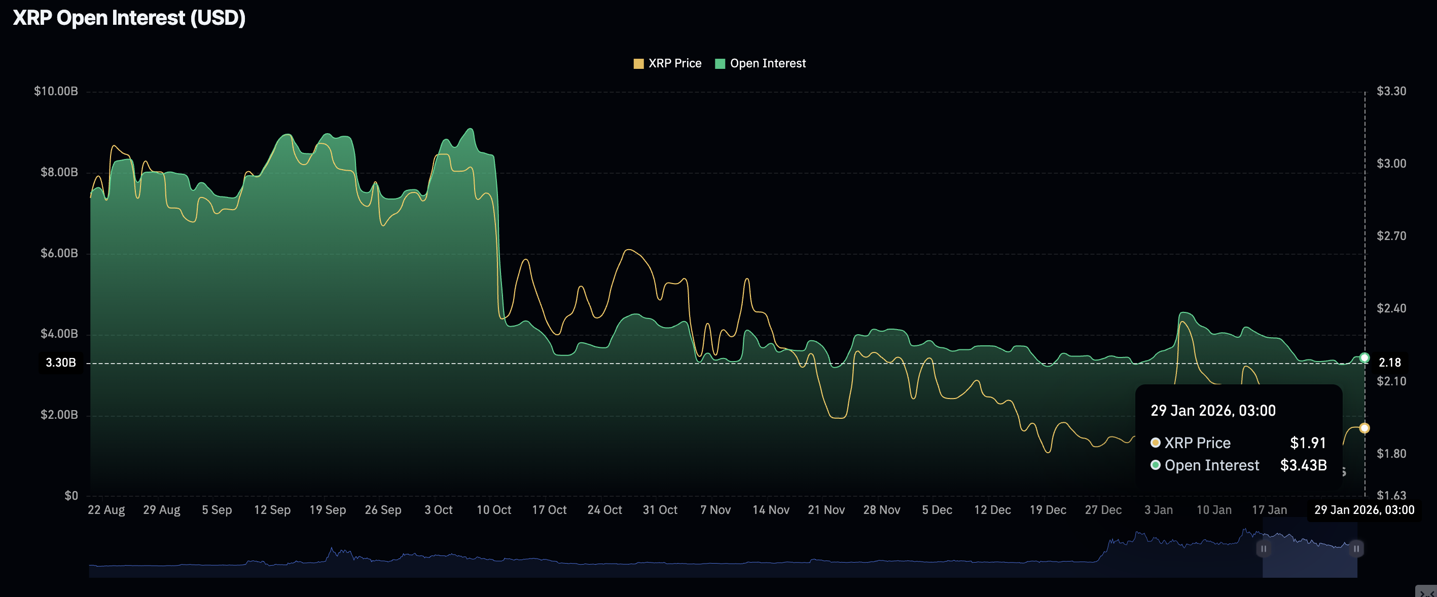 - Minat ritel terhadap XRP terhenti, dengan Open Interest berjangka tetap stabil di $3,43 miliar pada hari Kamis.