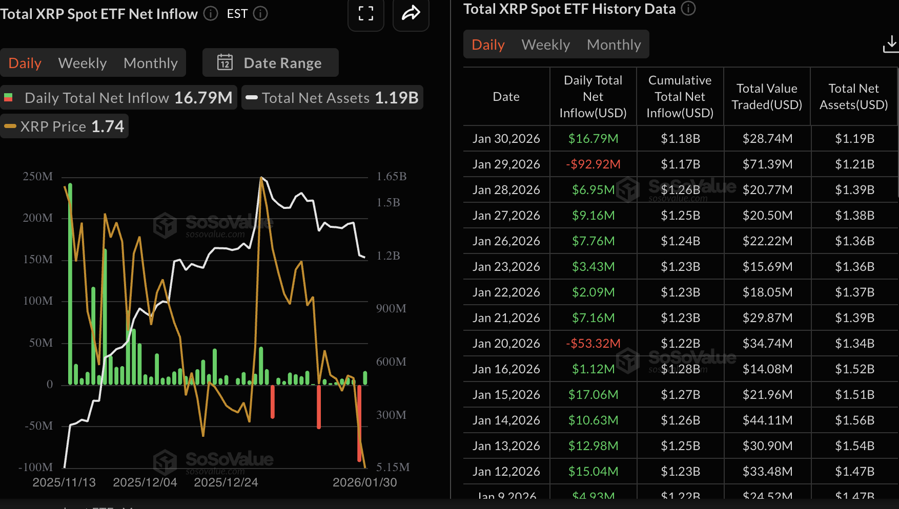 Investor institusional beralih ke XRP saat kerugian menyebar di seluruh pasar kripto, menempatkan dana ke dalam Exchange-Traded Funds (ETF) spot. Produk investasi kripto yang melacak harga spot XRP mencatat arus masuk hampir $17 juta pada hari Jumat setelah mencatat arus keluar satu hari terbesar sejak peluncuran sebesar hampir $93 juta pada hari Kamis.