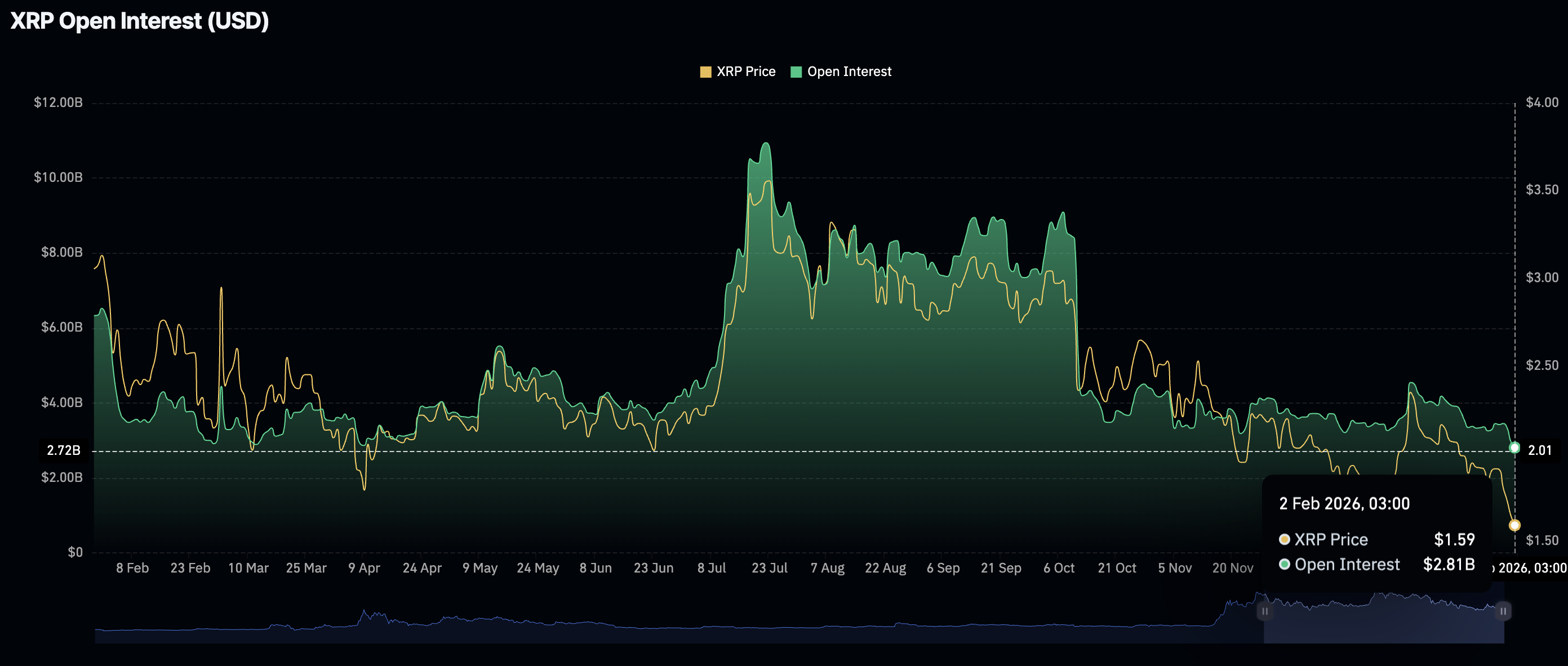 - Minat ritel terhadap XRP terus menurun, dengan Open Interest berjangka turun menjadi $2,81 miliar