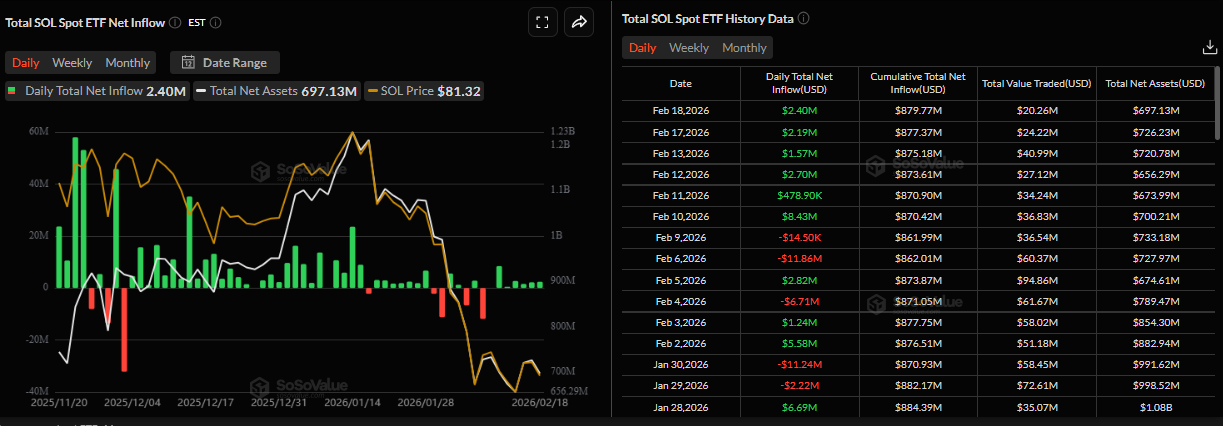 Grafik SoSoValue di bawah menunjukkan bahwa Exchange-Traded Funds (ETFs) spot mencatat arus masuk sebesar $2,40 juta pada hari Rabu, menandai rentetan arus positif terpanjang sejak 10 Februari. Meskipun ada permintaan institusional, aksi harga SOL gagal merespons secara positif, menyoroti tekanan jual yang persisten dan keyakinan yang terbatas di antara para pedagang.