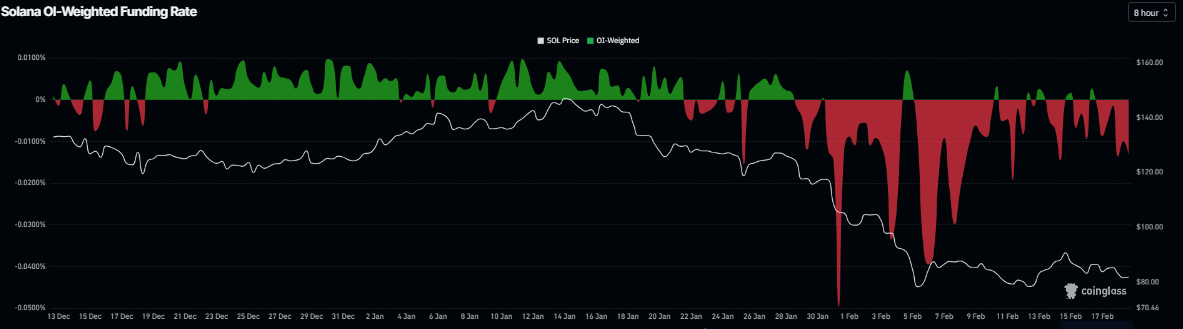 Di sisi derivatif, data Suku Bunga Pendanaan Berbasis OI CoinGlass menunjukkan bahwa jumlah pedagang yang bertaruh bahwa harga Solana akan turun lebih jauh terlihat lebih tinggi daripada mereka yang mengantisipasi kenaikan harga. Metrik ini berubah negatif pada hari Selasa dan berada di -0,0133% pada hari Kamis. Rasio negatif ini mengindikasikan bahwa posisi short membayar posisi long, mengindikasikan sentimen bearish pada Solana.