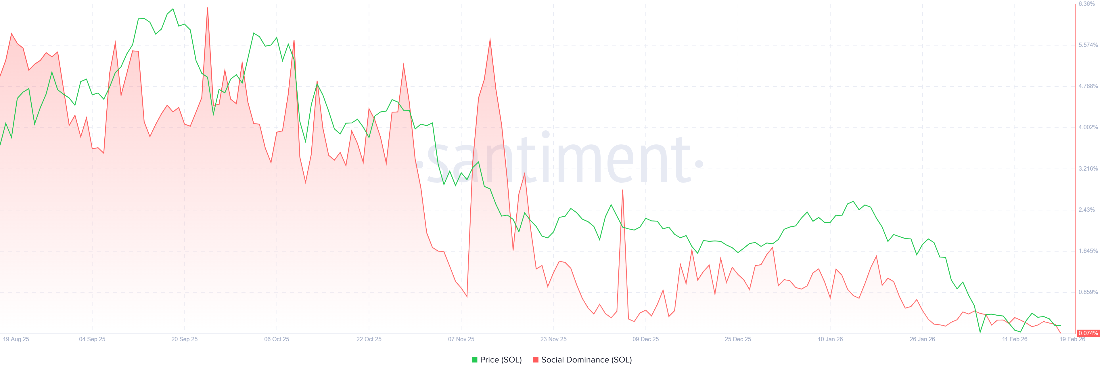 Metrik Dominasi Sosial Santiment untuk Solana mendukung prospek bearish. Indeks ini mengukur pangsa diskusi terkait SOL di media mata uang kripto. Metrik ini telah berada dalam tren menurun sejak akhir Desember, turun lagi di awal Februari ke 0,074% pada hari Kamis. Penurunan ini mengindikasikan minat pasar memudar dan melemahnya sentimen di antara para investor Solana.