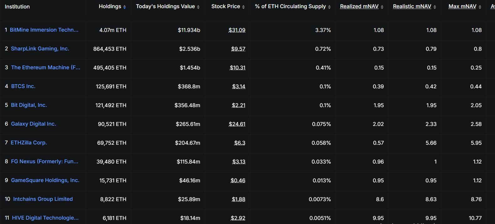 Diluncurkan dengan tujuan ambisius untuk mengakuisisi 5% dari pasokan ETH yang beredar, BitMine mengembangkan perbendaharaan ETH-nya untuk menjadi yang terbesar secara global dalam beberapa bulan setelah diluncurkan. Perusahaan ini telah mengakumulasi 3,97 juta ETH sejak bulan Juli dan kini menduduki peringkat kedua terbesar di belakang Strategy.