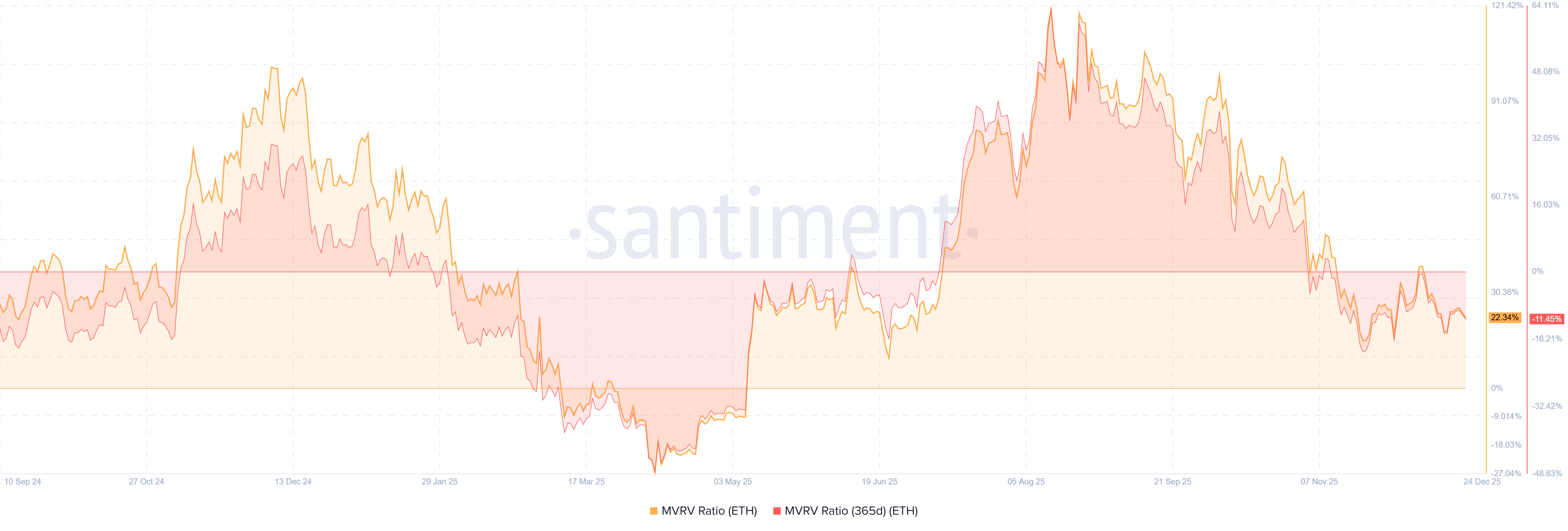 MVRV 365 hari menunjukkan semua dompet yang membeli ETH pada tahun 2025 mengalami kerugian 11%. Sementara itu, Rasio MVRV yang mencakup semua menunjukkan bahwa semua investor dalam posisi untung 22%.