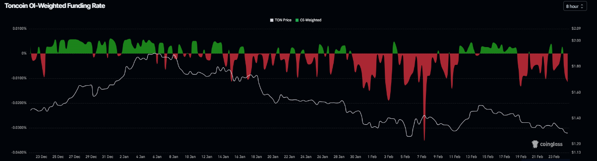 Di sisi derivatif, tingkat pendanaan negatif TON semakin memproyeksikan sentimen bearish. Metrik ini menjadi negatif pada hari Selasa dan berada di -0,011% pada hari Rabu, mendekati level yang terlihat pada 19 Februari, ketika harga TON jatuh tajam. Rasio negatif menunjukkan bahwa posisi jual membayar posisi beli, menunjukkan sentimen bearish terhadap Toncoin.