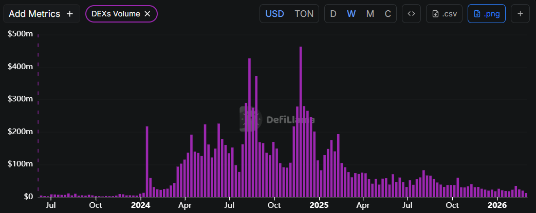 Data DefliLlama menunjukkan bahwa volume perdagangan mingguan Toncoin di Bursa Terdesentralisasi (DEXs) telah menurun menjadi $12,6 juta sejauh minggu ini, level terendah sejak awal Januari 2024. Penurunan volume ini menunjukkan penurunan minat dan likuiditas para pedagang di Toncoin, meningkatkan prospek bearish-nya.