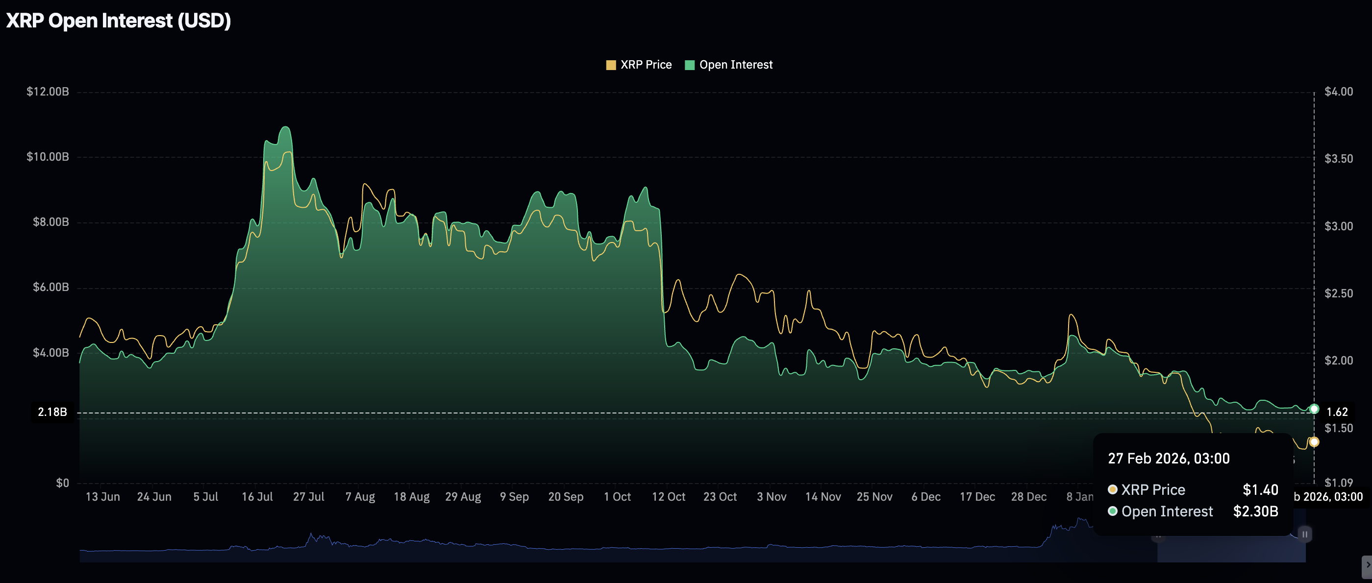 Minat investor ritel terhadap XRP terus menurun, seperti yang dibuktikan dengan penurunan aktivitas derivatif. Penurunan dalam Open Interest berjangka (OI) menjadi $2,30 miliar pada hari Jumat, dari $2,35 miliar pada hari sebelumnya, menjadi perhatian bagi pasar derivatif. OI berada di level terendahnya sejak Januari 2025.