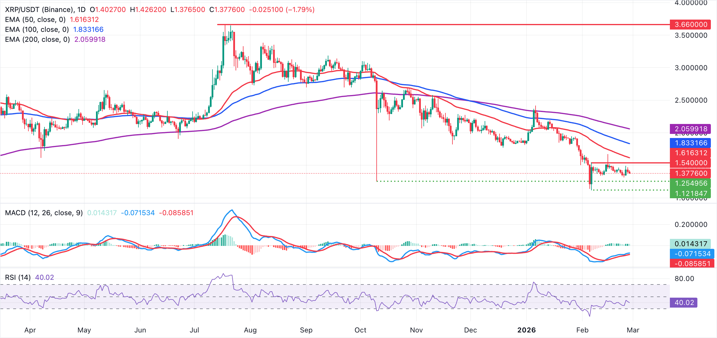 XRP diperdagangkan di sekitar $1,38 dengan bias jangka pendek yang sedikit bearish. Harga tetap jauh di bawah EMA 50, 100, dan 200-hari, yang terkelompok antara $1,62 dan $2,06. Ketiga rata-rata bergerak tersebut cenderung menurun, menjaga tren yang lebih luas di bawah tekanan meskipun ada lonjakan baru-baru ini dari level terendah mingguan di $1,31.