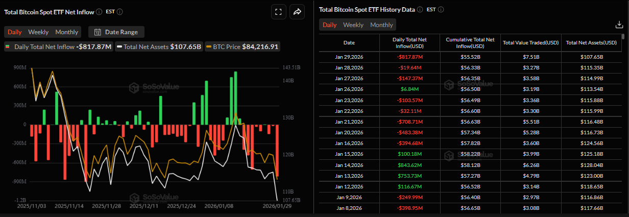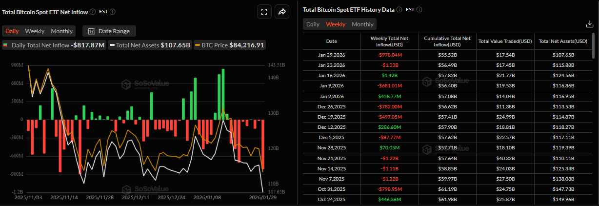 Koreksi harga Bitcoin minggu ini semakin didukung oleh menurunnya permintaan institusional. Grafik SoSoValue di bawah menunjukkan bahwa ETF Bitcoin yang diperdagangkan di bursa (spot) mencatat total arus keluar sebesar $978,04 juta hingga hari Kamis, menandai arus keluar mingguan kedua berturut-turut. Selain itu, arus keluar pada hari Kamis menyoroti arus keluar satu hari tertinggi sebesar $817,87 juta sejak 21 November. Jika arus keluar ini terus berlanjut dan meningkat, BTC dapat melihat koreksi lebih lanjut.