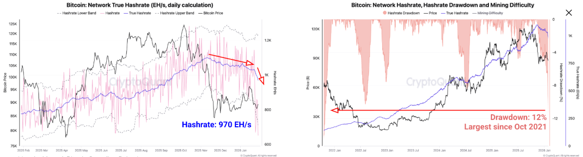 Penghentian ini telah mempercepat penurunan hashrate jaringan sebesar 12%, penurunan terbesar sejak Oktober 2021, dengan hashrate jatuh ke 970 EH/s, level terendah sejak September 2025, seperti yang ditunjukkan pada grafik di bawah ini.