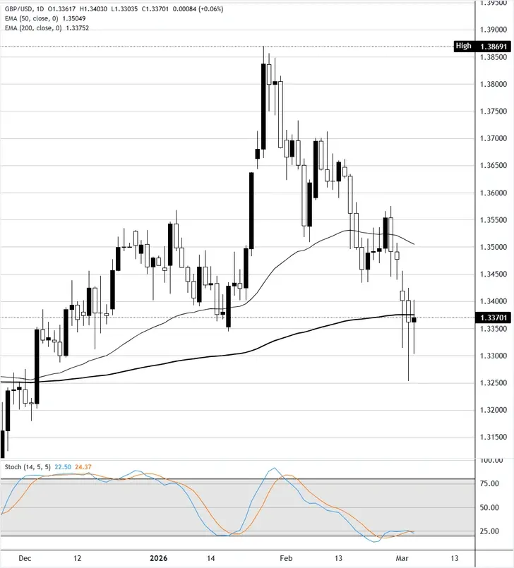 GBP/USD hampir datar pada hari Rabu, naik 0,08% untuk menetap di sekitar 1,3370 dalam sesi yang tenang. Pasangan ini telah jatuh tajam dari puncak akhir Januari di dekat 1,3870 dan kini sedang menguji Exponential Moving Average (EMA) 200-hari, dengan peta panas forex satu minggu ini menunjukkan Pound Sterling sebagai salah satu yang berkinerja terburuk terhadap Dolar AS, turun sekitar 1,4% dalam seminggu.