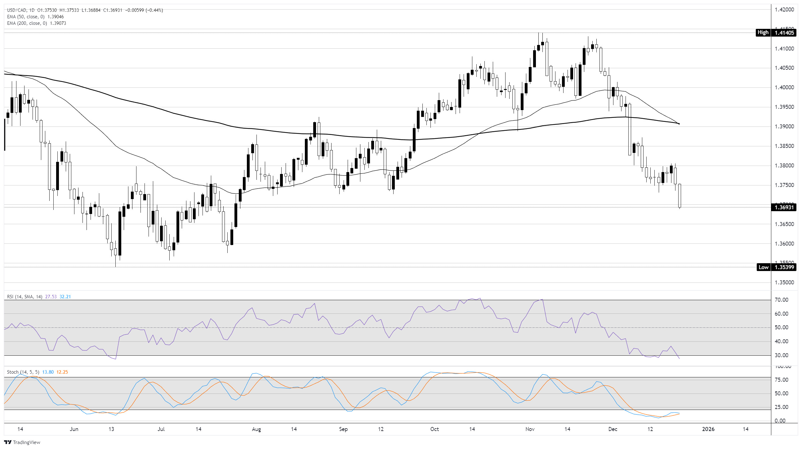 Grafik harian USD/CAD menunjukkan perpanjangan tajam ke bawah setelah penembusan yang jelas di bawah rata-rata pergerakan 50-hari dan 200-hari, mengonfirmasi pergeseran momentum jangka pendek yang mendukung Dolar Kanada. Harga telah mempercepat penurunan dari puncak pertengahan Desember di dekat 1,41 dan kini menekan ke arah batas bawah kisaran terbarunya, dengan lilin-lilin terbaru mencerminkan tekanan jual yang persisten. Namun, indikator momentum menunjukkan bahwa pergerakan ini mungkin mulai melebar. RSI telah jatuh ke angka tinggi 20-an, jauh di bawah ambang batas 30 yang biasanya terkait dengan kondisi jenuh jual, sementara osilator stokastik sangat tertekan dan mulai datar, menandakan bahwa momentum penurunan mungkin kehilangan intensitas.