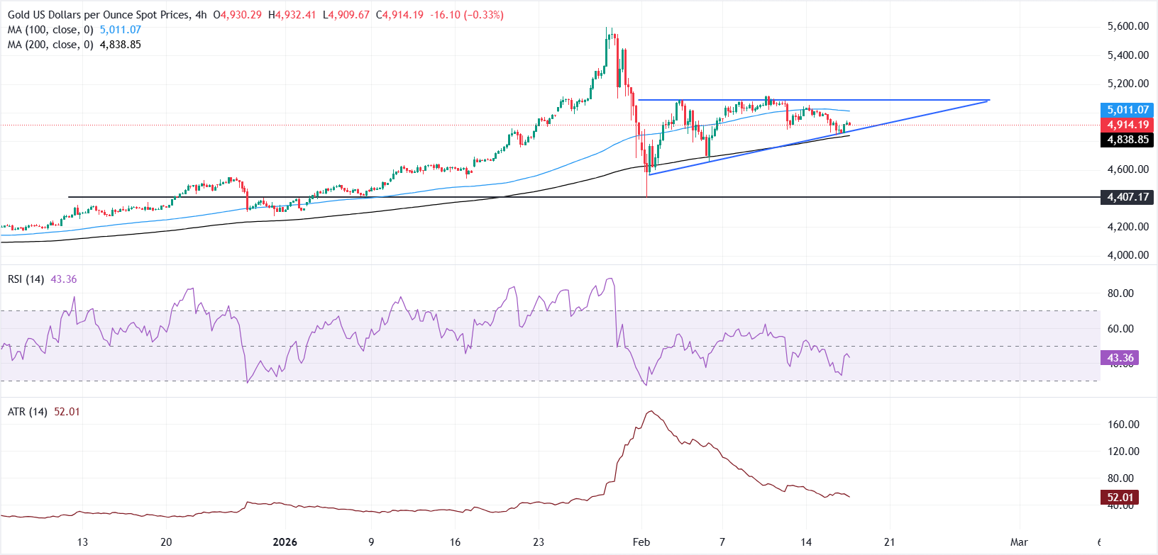 Dari perspektif teknis, grafik 4 jam menyoroti tarik menarik yang jelas antara para pembeli dan penjual, mencerminkan ketidakpastian pasar. Harga diperdagangkan di bawah Simple Moving Average (SMA) 100-periode di $5.011,07 dan bertahan di atas SMA 200-periode di $4.838,85, meninggalkan bias campuran dengan kecenderungan bearish ringan.