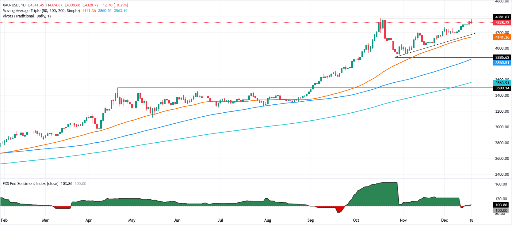 Jika XAU/USD ditutup di bawah $4.350 secara harian, support pertama akan berada di $4.300. Penembusan di bawah level tersebut akan mengekspos level tertinggi 11 Desember di $4.285, dengan support lebih lanjut di $4.250 sebelum pullback yang lebih dalam menuju $4.200.