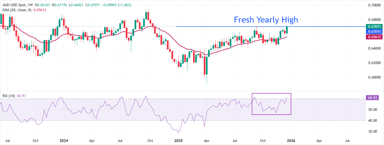 - AUD/USD memperbarui tertinggi tahunan di 0,6717 saat Dolar Australia unggul secara keseluruhan.