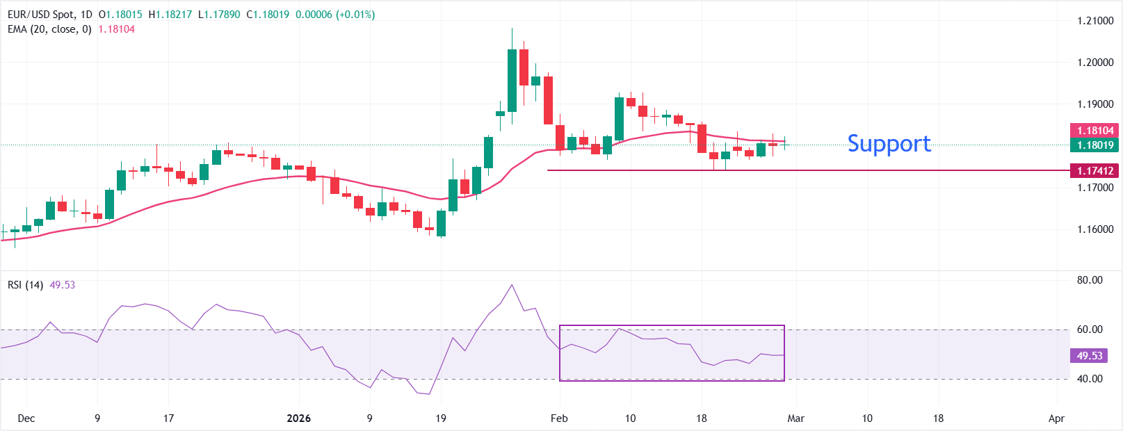 EUR/USD diperdagangkan mendatar di sekitar 1,1800 pada saat berita ini ditulis. Pasangan mata uang ini berkonsolidasi di dekat exponential moving average 20-hari, yang telah datar di sekitar 1,1810, menandakan hilangnya keyakinan arah setelah kenaikan sebelumnya. Aksi harga terhenti di bawah area 1,19 terbaru, sementara RSI telah diperdagangkan di dalam kisaran 40,00-60,00, mengindikasikan momentum netral. Secara keseluruhan, bukti mengarah ke bias netral yang luas dalam jangka pendek.