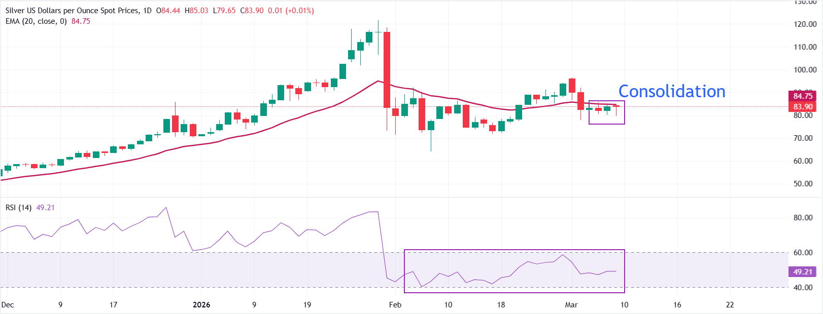 XAG/USD diperdagangkan sedikit lebih rendah di sekitar $83,90 pada saat berita ini ditulis. Bias jangka pendek adalah netral karena harga spot diperdagangkan dekat dengan Exponential Moving Average (EMA) 20-hari, yang telah datar di dekat $84,75. Aksi harga telah berosilasi di sekitar average ini selama beberapa sesi, menandakan kurangnya keyakinan arah setelah pembalikan tajam bulan April dari di atas $110.