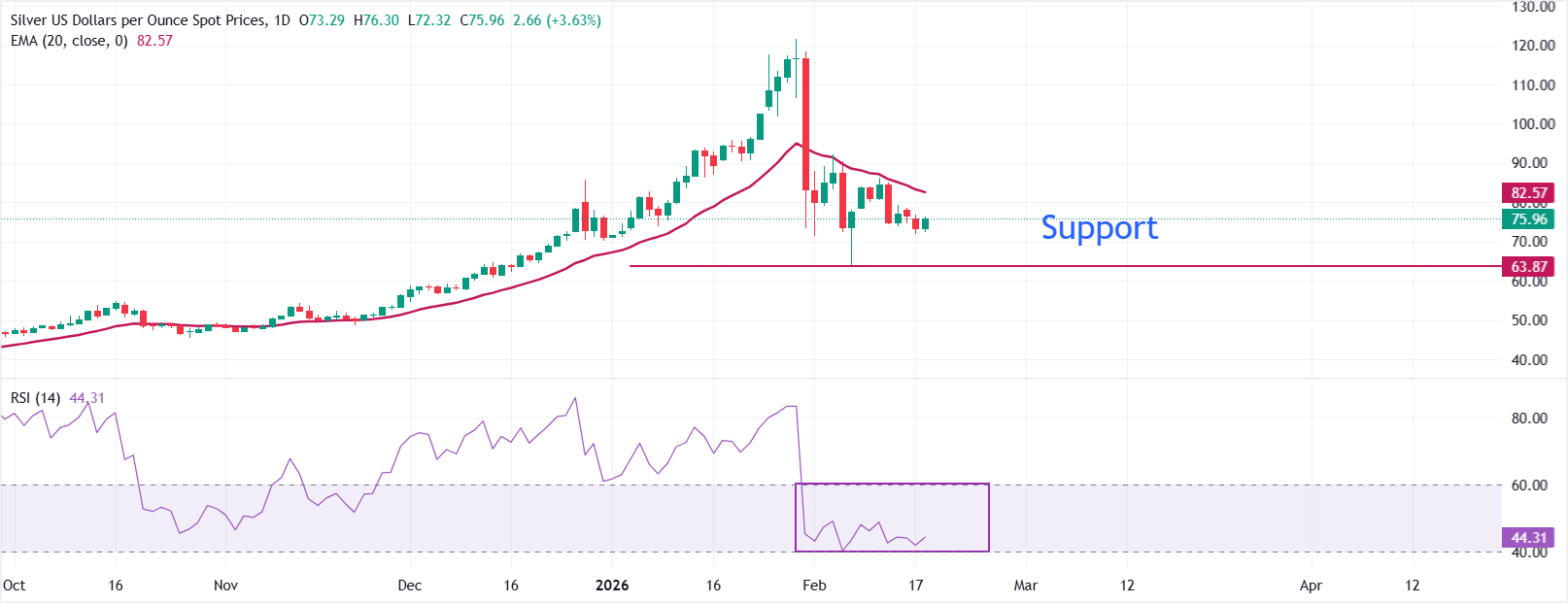XAG/USD melonjak mendekati $76,30 pada saat berita ini ditulis. Exponential Moving Average (EMA) 20 periode miring ke bawah di $82,57, menandakan tren jangka pendek melemah. Harga di bawah indikator ini membatasi rebound dan menjaga risiko cenderung ke bawah.