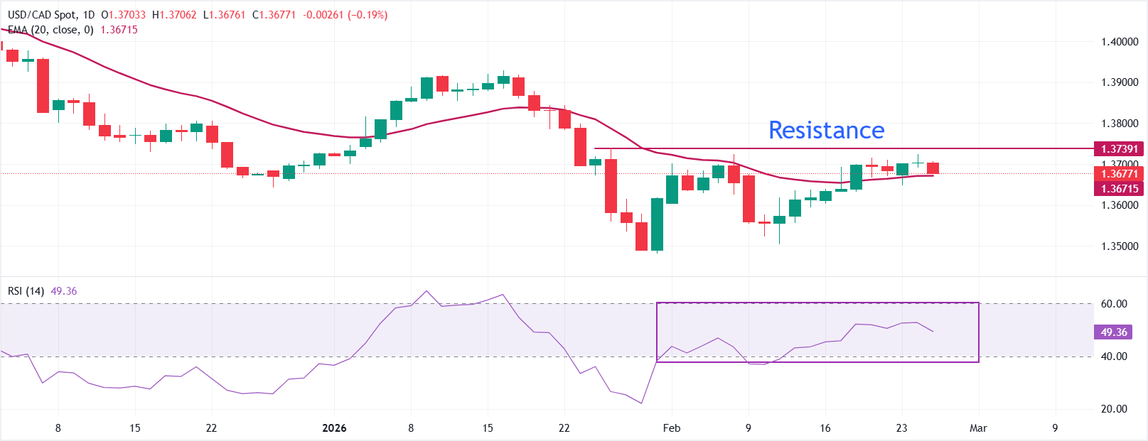 USD/CAD diperdagangkan lebih rendah di sekitar 1,3675 pada saat berita ini ditulis. Pasangan mata uang ini memiliki bias bullish yang ringan saat stabil di atas Exponential Moving Average (EMA) 20-hari di dekat 1,3670, menjaga aksi harga selaras dengan tren naik yang lebih luas yang dimulai dari pertengahan 1,34-an. Harga dapat melanjutkan ke level tertinggi 23 Januari di sekitar 1,3800 jika berhasil menembus di atas level tertinggi 27 Januari di 1,3740.