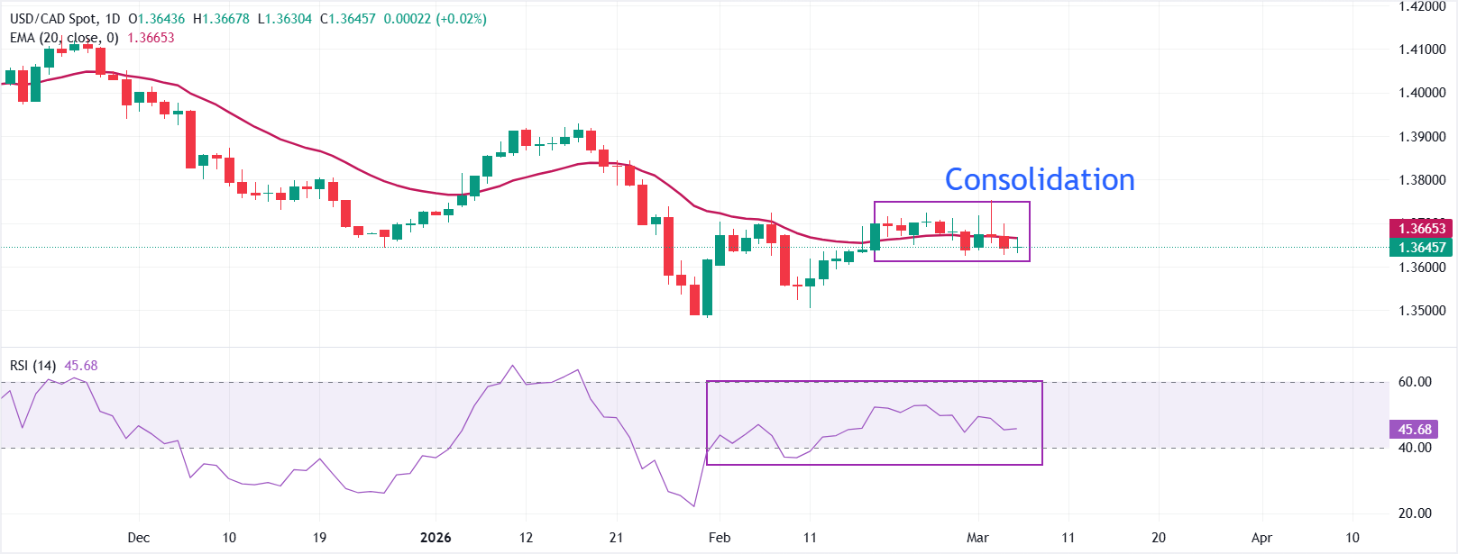 USD/CAD diperdagangkan datar di sekitar 1,3645 pada saat berita ini ditulis. Bias jangka pendek adalah netral karena spot mendekati Exponential Moving Average (EMA) 20-hari di sekitar 1,3665.