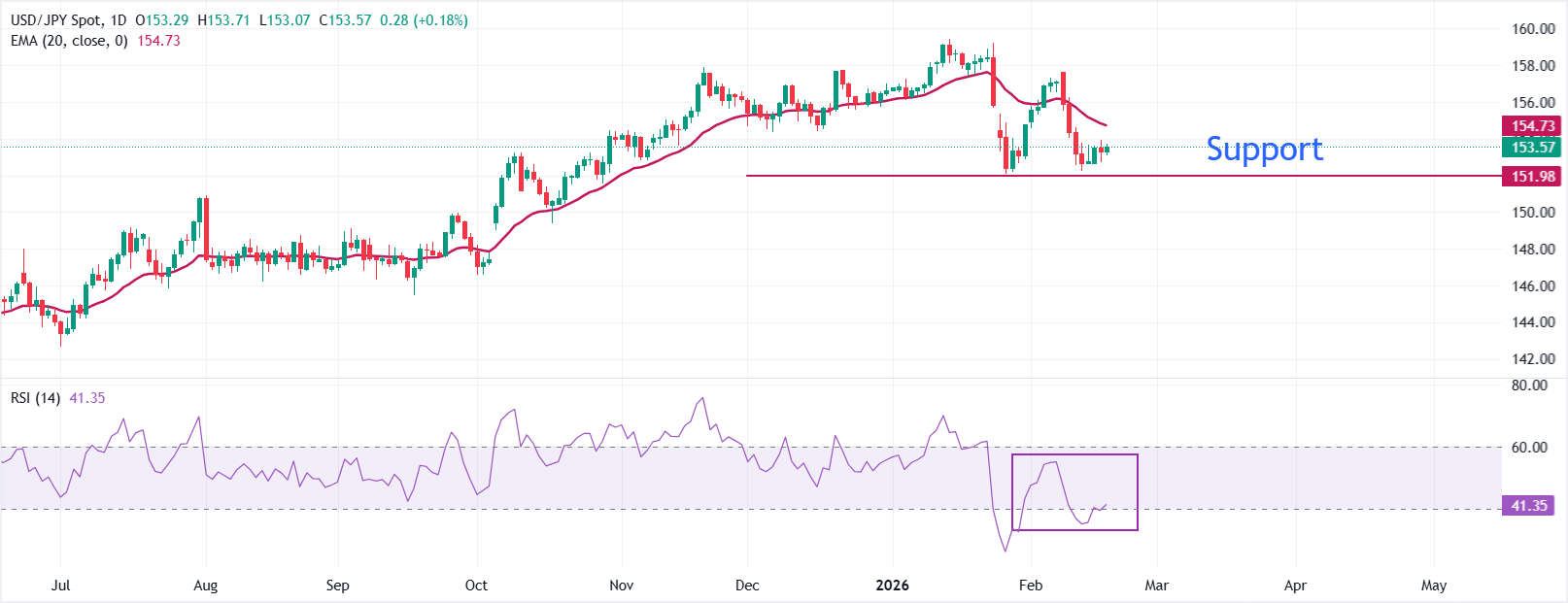 USD/JPY naik ke 153,57 selama sesi Eropa pada hari Rabu. Harga bertahan di bawah Exponential Moving Average (EMA) 20-hari di 154,73, menunjukkan bias turun dan menjadikan moving average sebagai resistance terdekat.