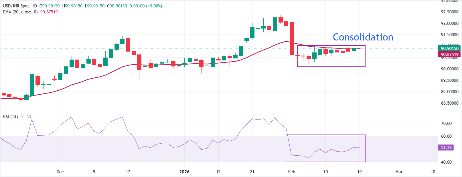 USD/INR menutup sesi Rabu dengan konsolidasi di sekitar 90,90. Exponential Moving Average (EMA) 20-hari telah menurun, menandakan tren yang melemah, sementara harga stabil sedikit di atas rata-rata di 90,87 untuk menjaga support jangka pendek tetap utuh. Selama beberapa hari perdagangan terakhir, pasangan mata uang ini telah diperdagangkan dalam kisaran ketat antara 90,18 dan 91,00.