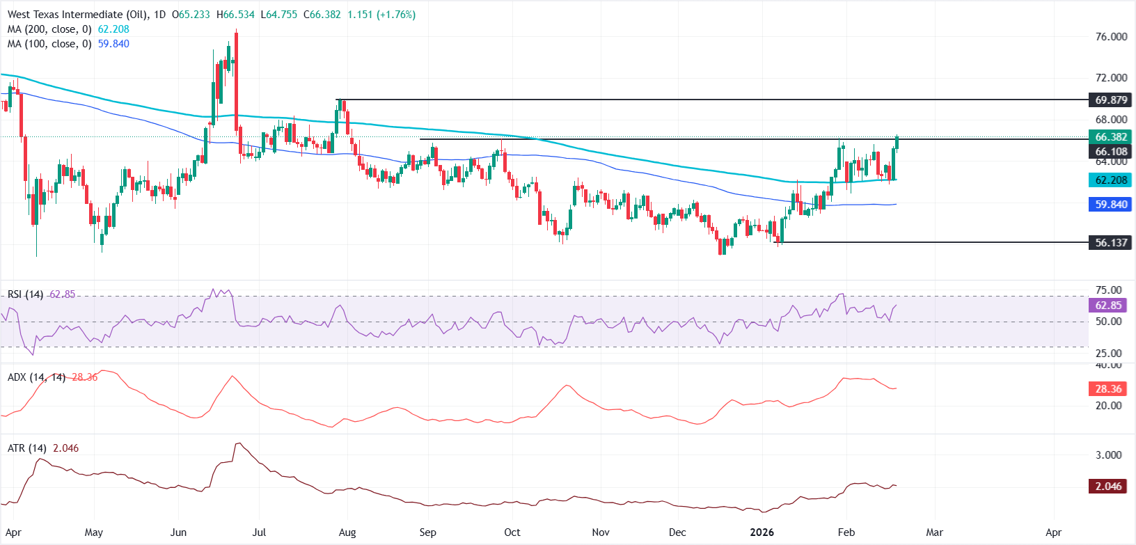 West Texas Intermediate (WTI) melanjutkan kenaikannya pada hari Kamis setelah rally hampir 4,9% sehari sebelumnya, karena meningkatnya ketegangan AS-Iran memicu kekhawatiran akan potensi gangguan pasokan di Timur Tengah. Pada saat berita ini ditulis, patokan AS diperdagangkan di sekitar $66,38 per barel, mencapai level tertinggi sejak Agustus 2025.